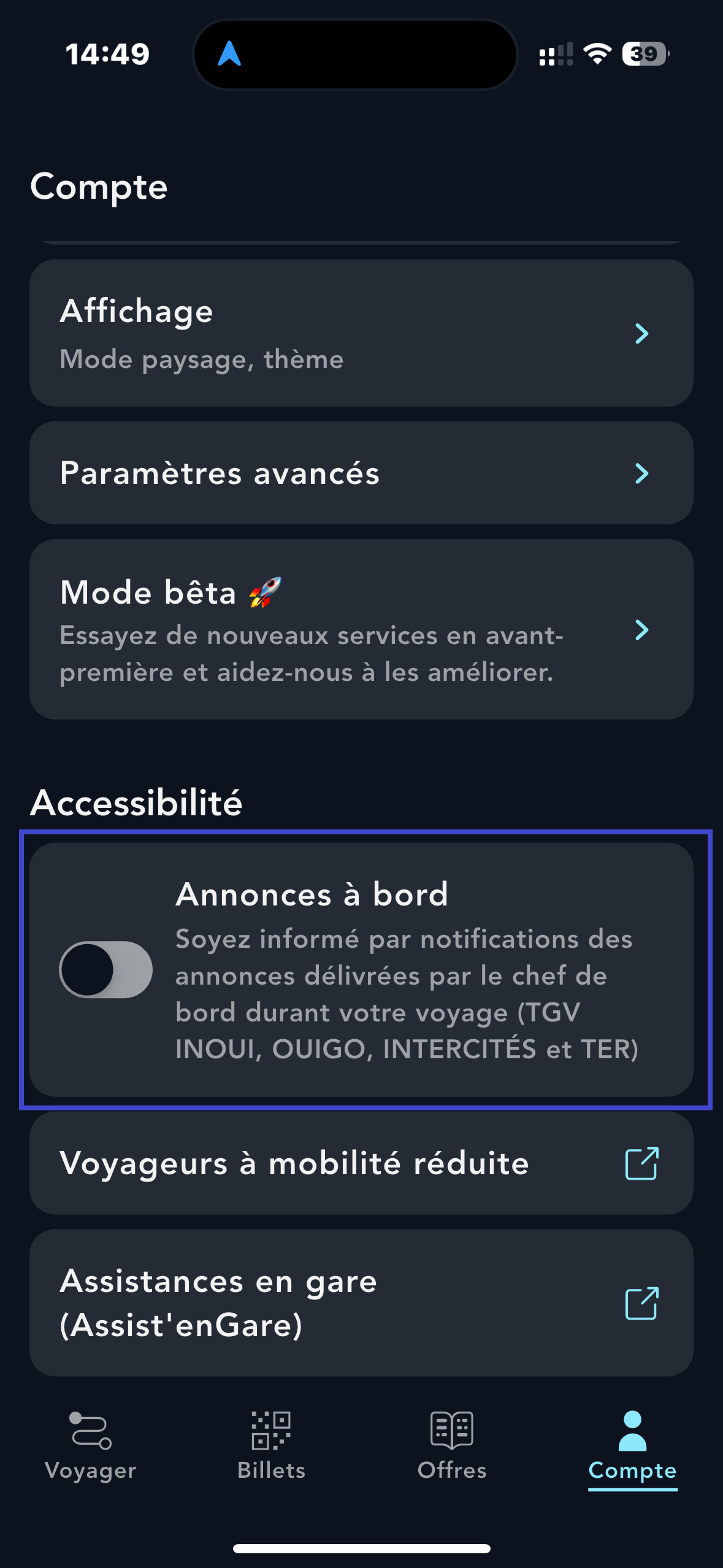 infosPour ne plus être notifié des annonces à bord de votre train, il vous suffit de désactiver l’option depuis la rubrique « Compte ».
