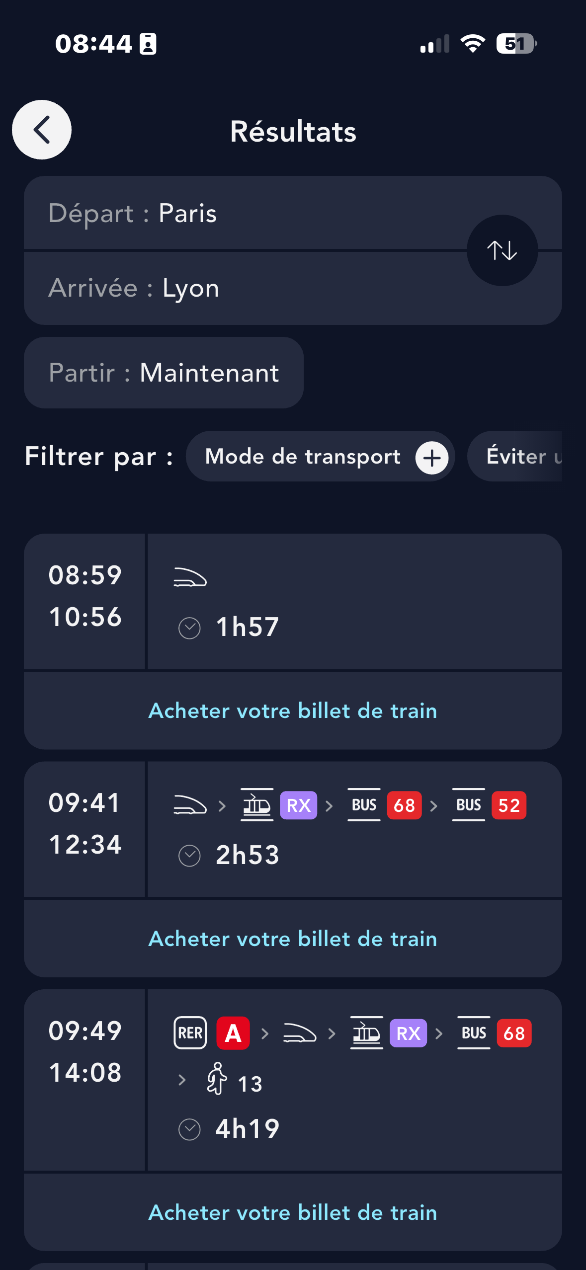 Choisissez le train souhaité parmi les résultats proposés en appuyant sur "Voir plus d'infos"