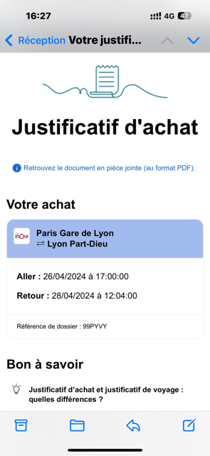 Vous pouvez aussi obtenir votre justificatif depuis la rubrique “Billets”. Pour cela, cliquez sur "Gérer la réservation" puis sur “Justificatifs d’achat et de voyage”. Cliquez ensuite sur "Obtenir le justificatif par e-mail" et renseignez votre adresse e-mail. Vous pourrez ainsi télécharger votre justificatif au format PDF depuis l'e-mail reçu.