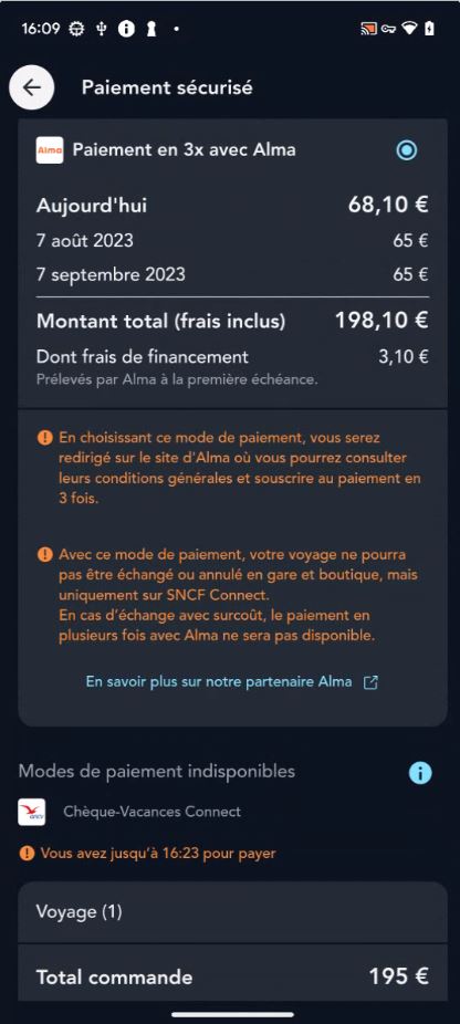 Ce mode de paiement est disponible pour toute commande à partir de 120€ et jusqu’à 2000€ tous transporteurs confondus (TGV INOUI, OUIGO, INTERCITES, TER, TGV Lyria, Eurostar (vers l'Angleterre), Eurostar (vers la Belgique, les Pays-Bas et l'Allemagne) et bus (FlixBus et BlaBlaCar).
