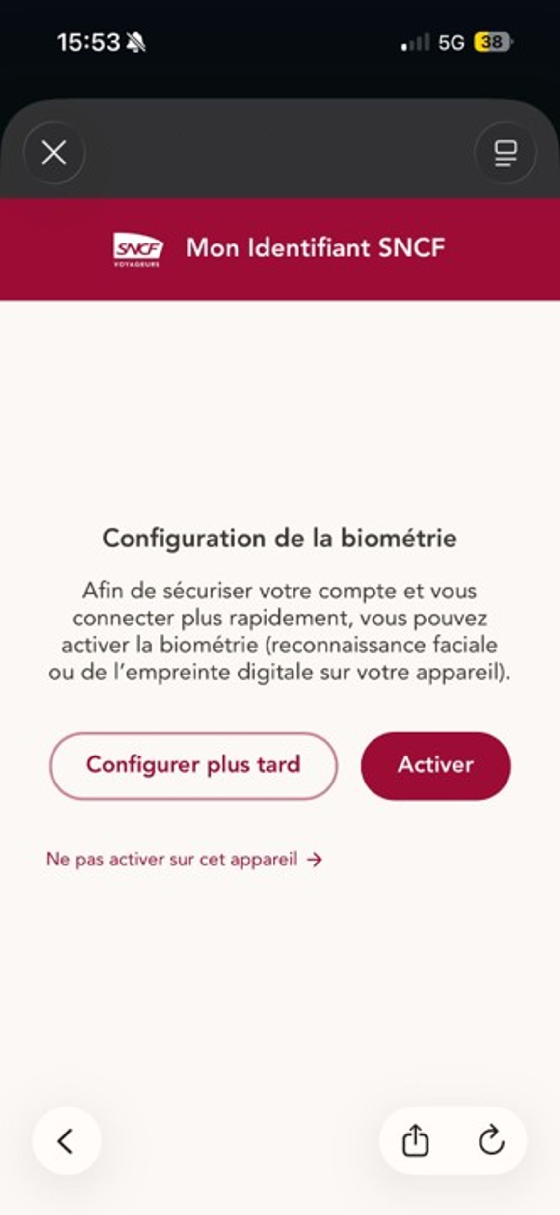 Si vous ne souhaitez pas configurer la biométrie, cliquez sur "Ne pas activer sur cet appareil" pour conserver votre mode de connexion habituel.
