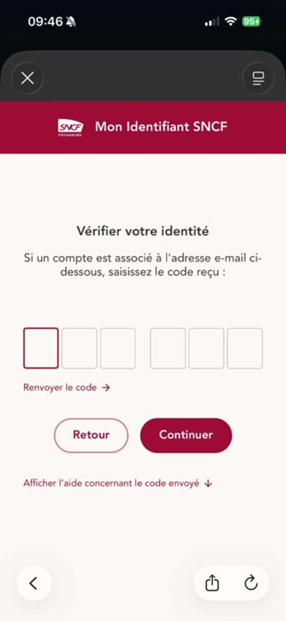 Cette évolution a entrainé la déconnexion automatique à votre compte. Pour accéder à vos informations de voyage et à vos billets, il vous suffit de vous reconnecter avec vos identifiants habituels en saisissant votre e-mail, votre mot de passe et le code de vérification envoyé sur votre adresse e-mail puis de vous laisser guider pour activer la biométrie.